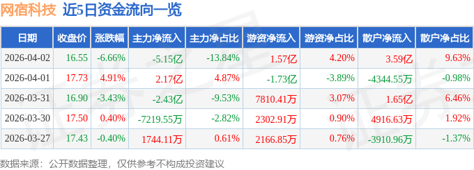 97国际-至尊品牌,源于信誉-证券之星消息,截至2026年4月2日收盘,网宿科技(300017)报收于16.55元,下跌6.66%,换手率9.65%,成交量222.55万手,成交额37.24亿元。