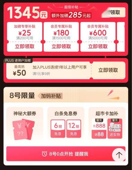 即日起至1月8日24点,京东将为正式PLUS会员发放超1345元的超级补贴券,包括满500减60元、满1500减180元、满3000减360元、满5000减600元、时尚专属补贴满1000减120元、健康汽车专属补贴满200减25元补充券;1月8日当天还加码发放满888减88全品类券,用京东PLUS会员积分即可兑换。每位正式PLUS会员可在活动期间内领取一次,领取后即可在1月8日0点至24点内使用。