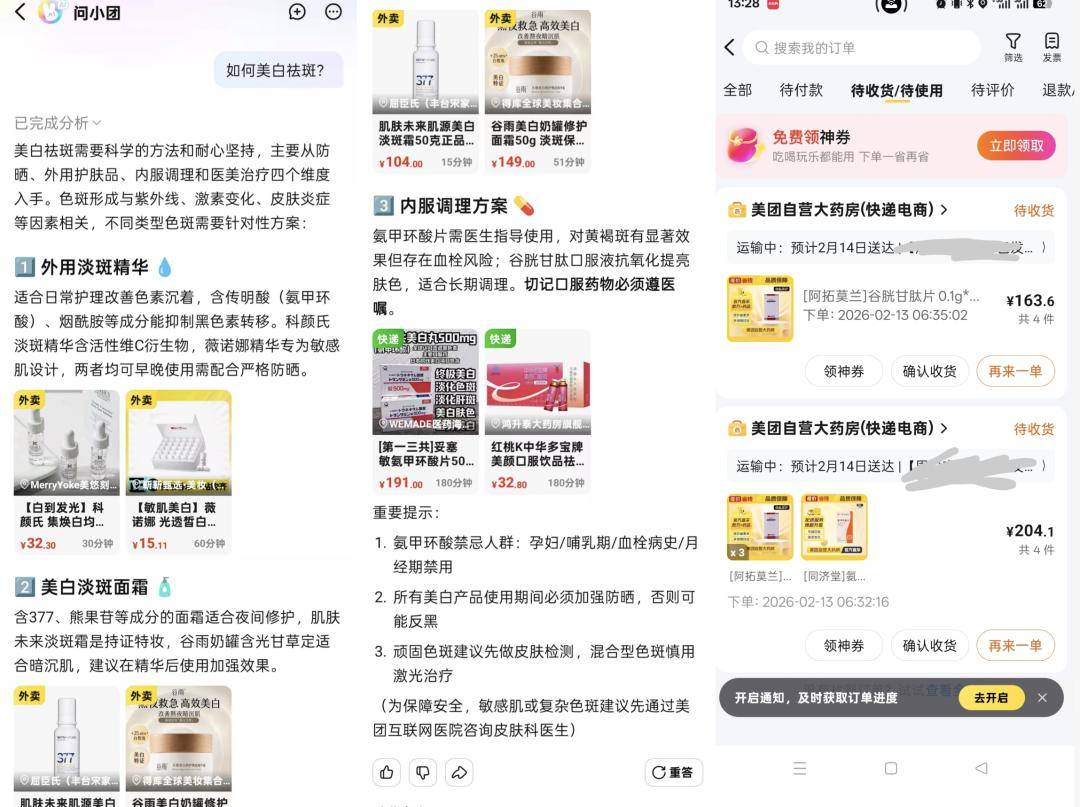 除了年夜饭之外,我们尝试向小团请教如何“美白祛斑”。小团直接给出了三条建议——外用淡斑精华、美白淡斑面霜、内服调理方案。同时,精准推荐了平台商家,且给出送货上门的时间——30分钟到50分钟上门。既帮用户省去了大量查询时间,又能直给精准的消费指引。