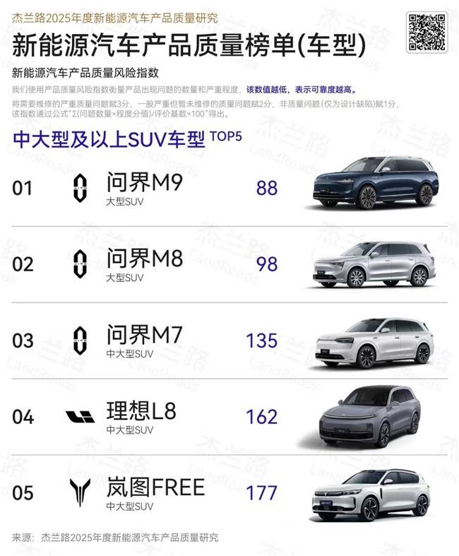 根据杰兰路最新发布的《2025年度新能源汽车产品质量研究》显示,在中大型及以上SUV市场中,新能源汽车产品质量排名第一的车型为问界M9;《2025年度中国汽车保值率报告》显示,问界M9包揽中国插混车型(含增程)及纯电动SUV保值率双项第一;根据杰兰路2024上半年-2025下半年新能源汽车品牌健康度研究显示,问界M9连续四次蝉联车型总榜净推荐值(NPS)第一,是新能源SUV车型中首个达成该成绩的产品。