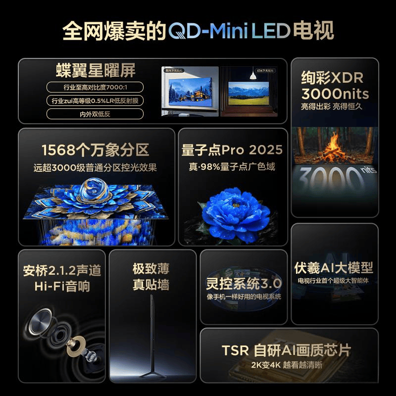 影院级视听体验:75英寸超大屏幕,搭配QD-Mini LED技术,为家庭影院提供逼真的画面和沉浸式音效。