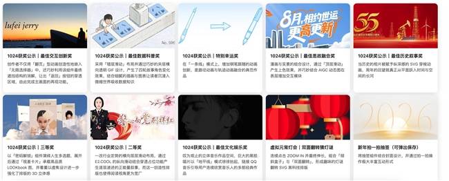 从本届获奖作品整体来看,参赛内容不再局限于节日营销或品牌展示,而是明显向公共议题、文化叙事与数据表达延展。高校组织、媒体机构与地方政务团队的参与比例持续提升,反映出 SVG 交互设计在公共传播领域的应用潜力。