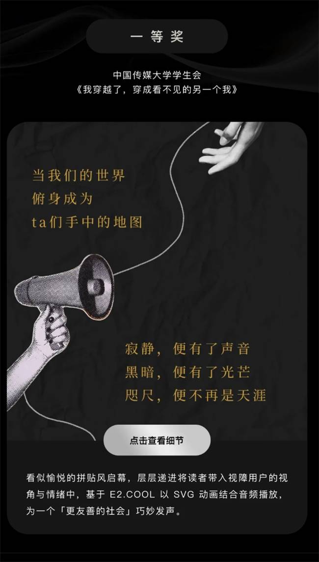 本届大赛一等奖由中国传媒大学学生会作品《我穿越了,穿成看不见的另一个我》获得。作品以拼贴风格为起点,通过 SVG 动画与音频播放的结合,引导读者进入视障群体的感知世界,在互动过程中逐步建立情绪共鸣,呈现出鲜明的人文关怀视角。