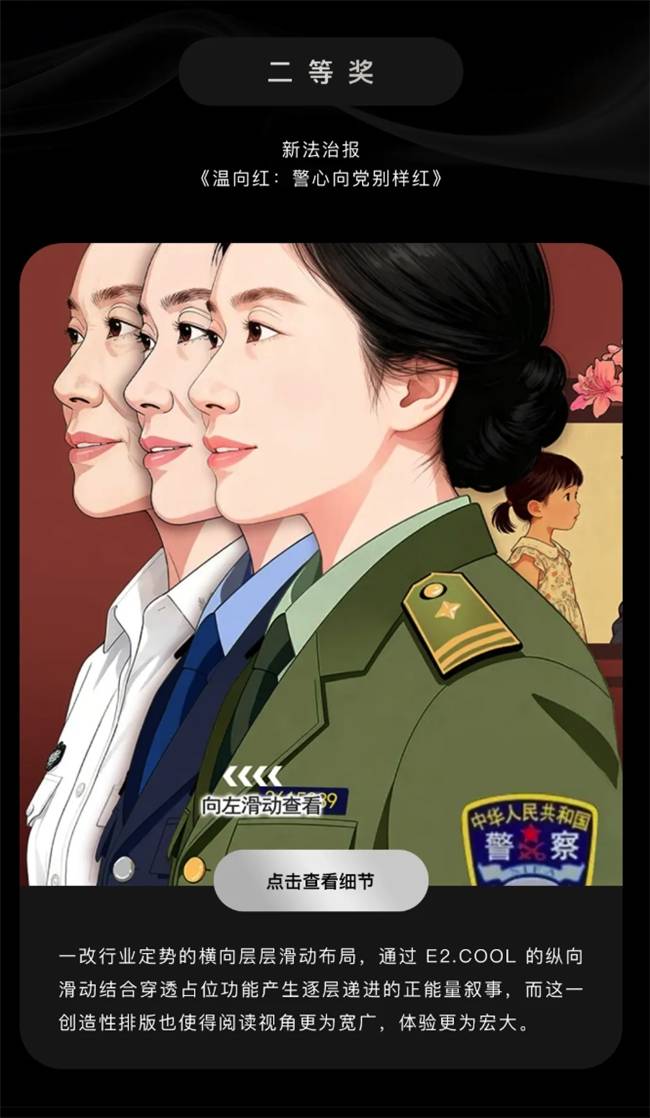 二等奖由新法治报作品《温向红:警心向党别样红》获得。作品突破了传统纵向长图的叙事方式,采用横向内容逻辑,通过纵向滑动、零高容器与占位机制,构建层层递进的阅读路径,使正能量主题呈现出更具空间感与仪式感的表达效果。