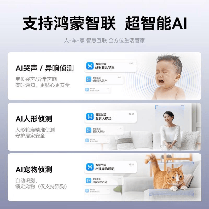 内置的智能AI侦测系统让家庭安全更加有保障,能够精准识别婴儿哭声和异常人形动静,再加上高效的存储能力,视频记录更为放心。配合64GB内置存储和先进的压缩技术,使得需要回放的视频文件储存更加高效。同时,通过华为智慧生活App实现与其他智能设备的联动,满足您全方位的智能家居需求,屏幕物理遮蔽则进一步确保了隐私安全。