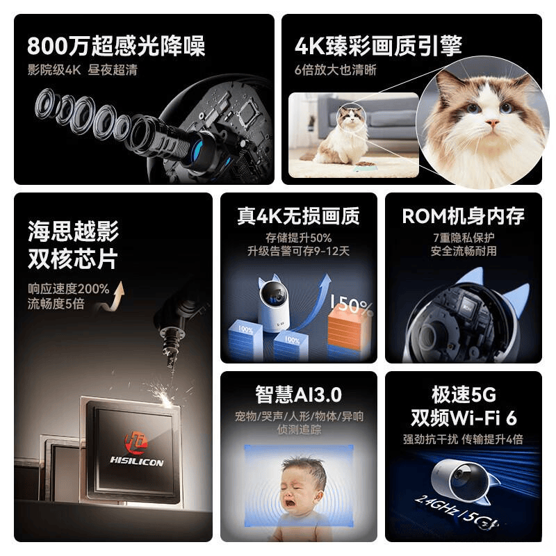 该产品具备卓越的智能录制与存储优化功能,能够仅记录关键片段,提高存储效率,节省宝贵时间。搭配星光夜视技术,即使在低光环境下也能呈现色彩鲜明的影像,使家庭安全无死角。此外,双频Wi-Fi6支持让设备连接更加灵活,融入智能家居生活,尽情享受科技带来的便利。